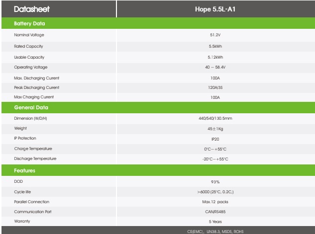 Batería de Litio (LiFePo4) Growatt 5.5kWh 51,2 V (106Ah) hasta 93% DOD; 6000 Ciclos a 25°C 0,2C –